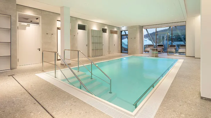 Großzügiges Solebecken (25,20 m², 1,35 m tief, 32 °C warm) mit einem Solegehalt von 1,7 %