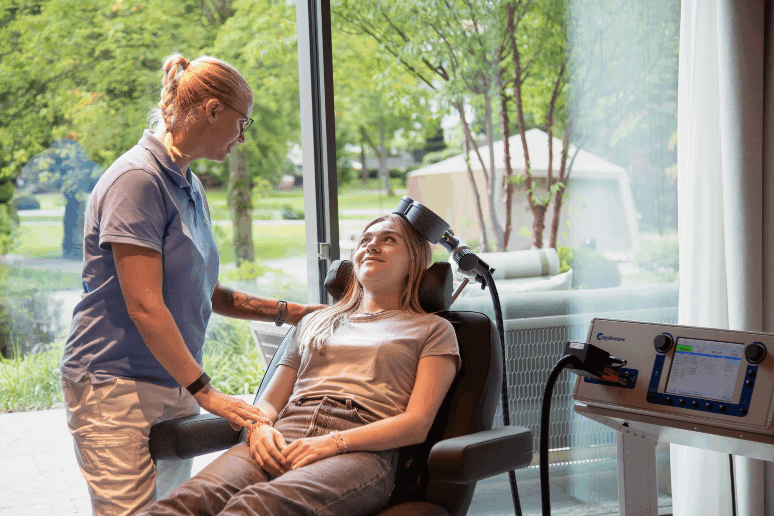 A magnetic coil is positioned externally on the head and sends short, repetitive pulses to specific areas of the cerebral cortex. This helps restore balance to disrupted neural networks. Its effectiveness has been proven in numerous placebo-controlled scientific studies.